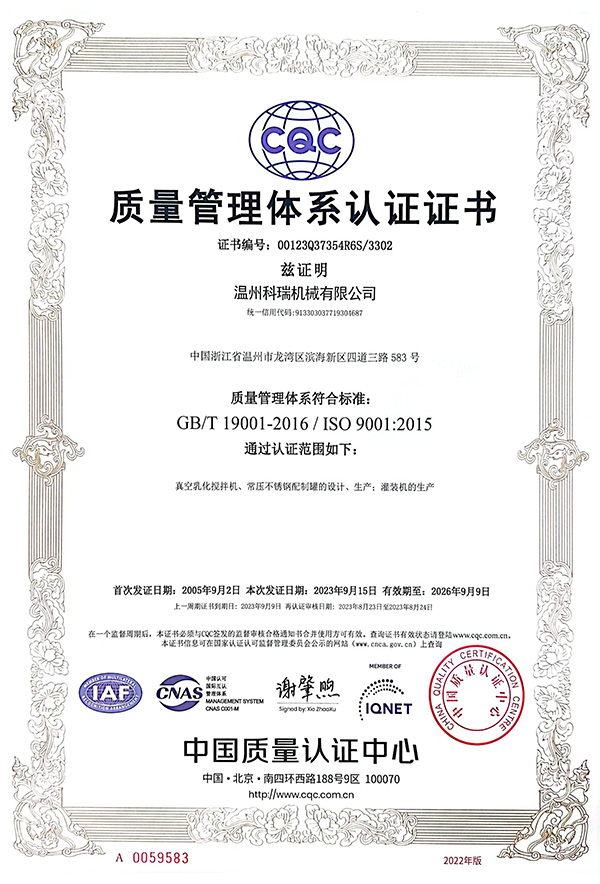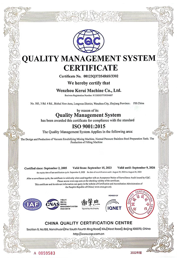 Wenzhou Kerui Machinery Co, Ltd. is the drafting member of the pharmaceutical vacuum emulsification blender industry standard,and the member of China Pharmaceutical Equipment Association,engaging in design,manufacture and sales of pharmacy,cosmetic,biotechnology equipment and hygiene fluid fittings, with reinforced technical force,fine processing equipment,complete quality control system and experienced in pharmacy,cosmetic,biotechnology and food machine.We are the leading manufacturer of vacuum emulsification machine and have the capability to design the products as request. We provide you the service from inquiry to lifetime use of equipment backing on our own design team and processing factory.
