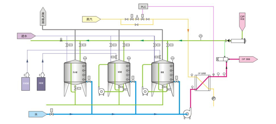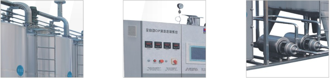 Full automatic CIP cleaning (Cleaning in place) is to carry out circulation cleaning and disinfection under the condition that no need to open the equipment (container, channel, pump etc. )and the whole producing line artificially.The ClP system produced by our company has features such as safety, save energy, high efficiency, convenient in operating and protection etc. The automatic CIP cleaning system consist of acid, alkali, hot water, pure water container, thick acid, thick alkali and heat exchanging instrument etc. According to automatic setting acid alkali density, the user can choose different cleaning process, different cleaning temperature, different cleaning time.The system PLC and the volume switch of touching screen, control valve and mater all use imported products with high quality, ensuring the accuracy and stability of system.