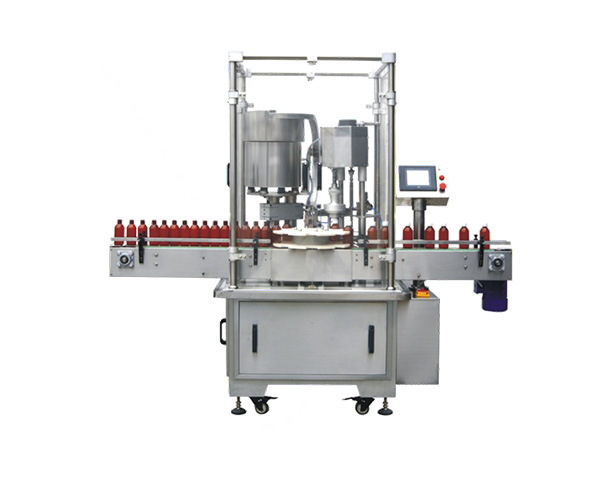 由星盤間歇式將瓶子帶至封蓋工位進行封蓋。附一組離合器,當有卡瓶或過載時,自動分離并停機,降低破損率,保證設(shè)備正常進行